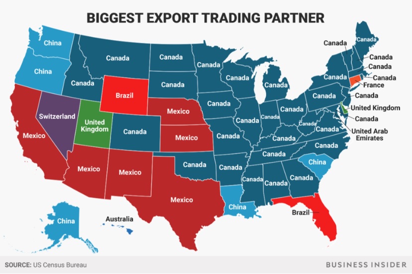 Canadian trade may not have a broad impact at the U.S. national level, but we are the largest export buyer for 32 states concentrated in the northern and eastern U.S., and they will be holding mid-term elections in October. (I’ve posted the map below before but it’s worth another look.)
